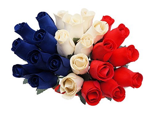 2 Dozen木製ローズ花、レッド、ホワイト、ブルー。