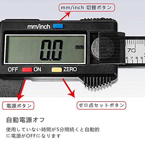 - 操作簡単:mm/inchの切替が可能:0(ゼロ)ポジションセッティング機能付でボタンを押すだけでゼロ点セットができる優れものです。なお、バッテリ寿命を節約するために、5分後に使用しない場合電源が自動にオフとなります。