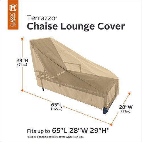 The terrazzo collection patio chaise cover by classic accessories provides high end protection at a value price. with an alluring combination of style and a durable woven polyester fabric, this cover protects against rain, snow, sun and dirt and won t crack in cold weather. air vents reduce inside condensation and wind lofting. stay on elastic loops fit over the legs to keep the cover on during high winds and breezy conditions. an elastic cord in the bottom hem provides a fast and custom fit. 1 year limited manufacturer warranty for workmanship and materials. not designed to entirely cover the wheels or leg bottoms. fits chaises up to 65"l 28"w 29"h.