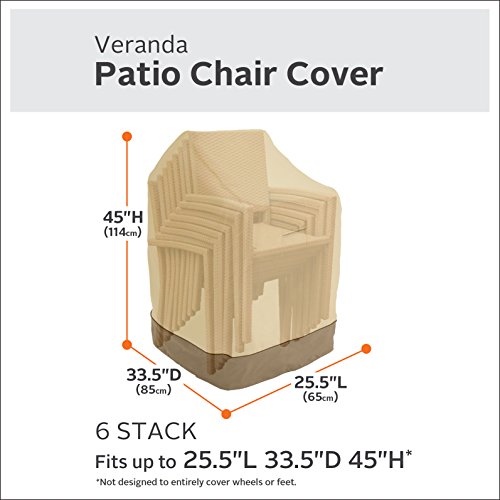 Stand up to Mother Nature in style with Classic Accessories Terrazzo patio furniture covers. The heavy-duty protective fabric wont crack in cold weather and Stay-on elastic loops fit over the legs of your stacked chairs to keep the cover on during windy days. The Stackable Chairs Cover features an elastic cord in the bottom hem for a fast custom-like fit and dual vents reduce inside condensation. Features: Rain-Tite protective fabric wont crack in cold weather Elastic cord in bottom hem for a fast and custom fit Dual vents reduce inside condensation Stay-on elastic loops fit over legs to keep cover on during winds One year warranty Stack up to 6 chairs 47"H x 28"W x 36"D