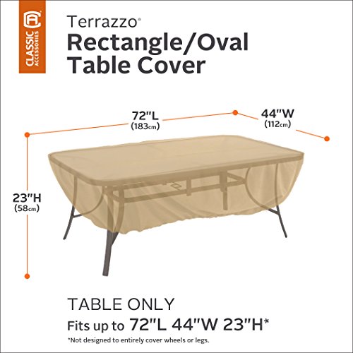 Fits rectangular or oval tables up to 72" L. x 44" W. x 23" H. The Terrazzo series of furniture cover from Classic Accessories provides high-end style and protection at a value price. Features include: Rain-tie protective fabric - 600 x 300 poly/PVC - provides protection against rain, snow, sun, and dirt and won't crack in cold weather. StayOn elastic - elastic loops fit over legs to keep cover on during high winds and breezy conditions. Custom fit - elastic cord in the bottom hem for a fast and custom fit. Air vents - reduce inside condensation and wind lofting. No. 58242: Shape: Oval/Rectangle, Material: Polyester/PVC, Color: Tan, Dimensions: 72" L x 44" W x 23" H ---- 1. 海外直輸入品となりますので、新品であっても、パッケージに多少のダメージがある場合もございますが、商品本体には問題ございませんのでご安心ください。2. 日本国内でのメーカーによる製品保証等は適用されません。3. パッケージや、説明書等は、英語表記となります。