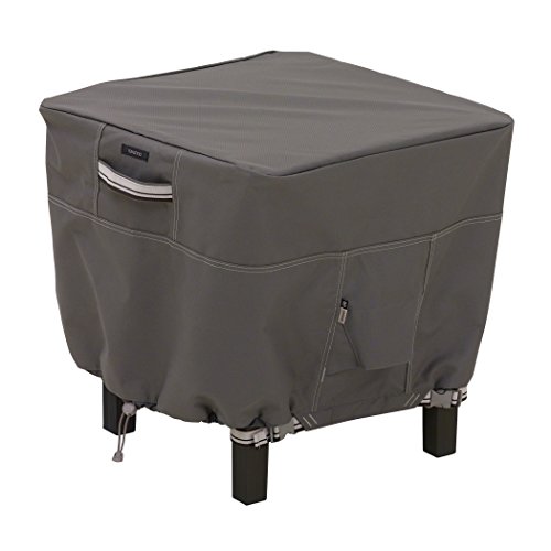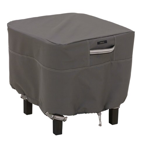 The Ravenna ottoman and side table covers from Classic Accessories combine a striking style with durability, fade-resistance and convenient features. Reinforced padded handles make removal easy while double-stitched seams add strength and a stylish accent. Structured vents stay open to prevent wind lofting and mildew and are lined with mesh barriers. Waterproof backing keeps furniture dry while elastic hem cords move easily through a special channel for a snug fit. The adjustable webbing belts slide easily for a tailored look and four custom-colored buckles will keep your cover secure in any weather. Striped webbing adds an attractive accent and is unique to the Ravenna collection. Available in several sizes to fit a variety of models, the Ravenna ottoman and side table cover adds style to your patio and will protect your furniture for years. Fits square ottomans and side tables up to 21"L by 21"W by 17"H