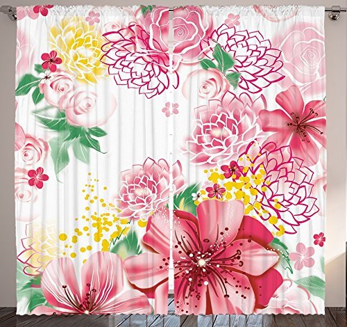 Flower Decor Curtains by Ambesonne Ornamental Spring Flowers Romantic Lilies Roses Floral Window Drapes 2 Panel Set for Living Room Bedroom Girl Room 108 X 90 Inches Pink Yellow Green and White【クリスマス】【ツリー】 [並行輸入品]