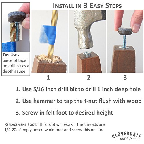 - 使用して家具levelerフィートのセットは8脚は、高さ調整と8 T爪ナットインストール手順を参照してください。ドリルして、交換の足をインストールするか、または木製家具脚として使用するティーを挿入する穴と5 / 16インチナットを外します。