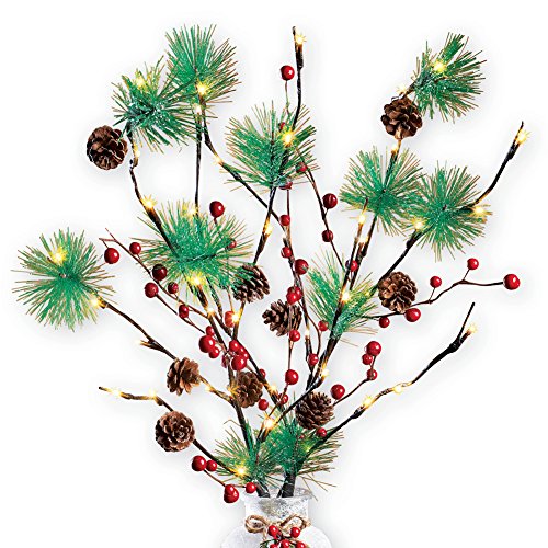 - 2つの松の枝の色は赤の果実、松ぼっくり、キラキラしたグリッターと20暖かい黄色のライトのロックを解除します。