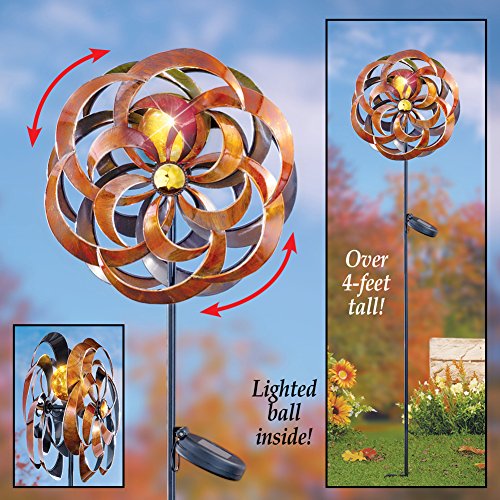 この豪華な風スピナーの特徴は、二重湾曲した風車と美しいアンバーガラスのボールをセンターに使用して夜間点灯時の太陽光発電。長い、スピナー上4-feetスタンド上に花と植物でスピンし、風とキャッチ両方の方向を示しています。は、1 " AA "電池を必要とします。ガラス、アクリル、アイアンを発売しました。メジャー12 " L x 6 " W x 49 1 / 2 " H