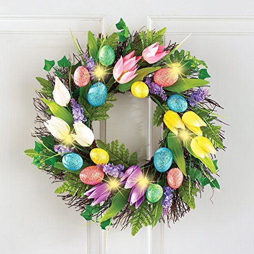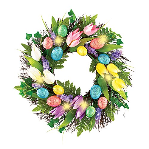 春の生き生きとした色のフルディスプレイの美しいイースター花輪。明るい色のチューリップ、きらめき卵、緑と輝くライトが魅力的な籐の花輪。背面のフックがぶら下がって、簡単に掛けることができます。要件:単4形電池3本(別売り)が必要です。ポリエステルとラタン。直径17インチ。