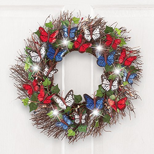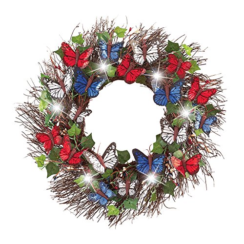 ご自宅に表示されフロントドアまたはどんな部屋に、この美しい花輪はレッド、ホワイト、ブルー蝶、緑と白のLEDライトの食事と愛国心に表示されます。の花輪REQ。3 " AAA "電池(別売)が必要です。下げ、背面のフックに簡単にすることができます。ラタン、プラスチック。17 " DIA。