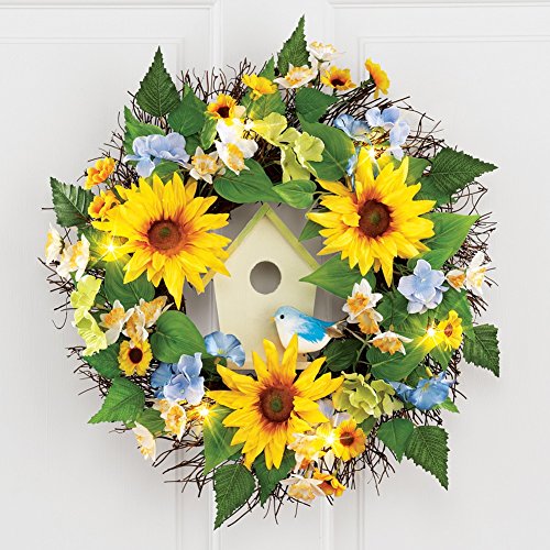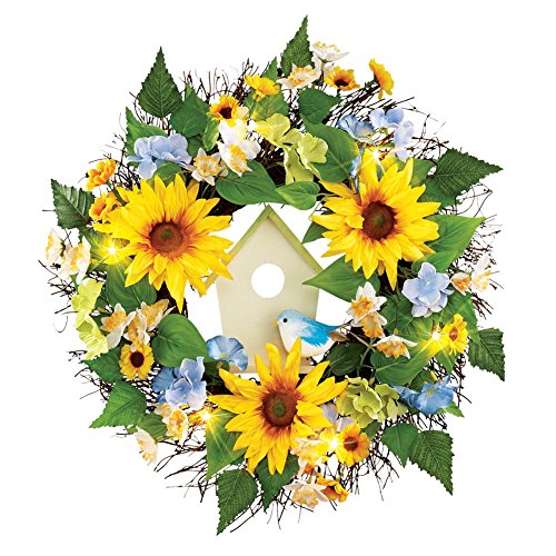 このカラフルで愉快で花輪は美しい方法フロントドアまたはご自宅のどの部屋を明るくします。の素敵な花輪機能black-eyed susans、ひまわり、ブルー、オレンジの花、緑と、ブルーバードの鳥小屋です。中央に配置されます。背面にフックが簡単に壁に掛けられます。プラスチック、ラタン、木製。サイズ:17 " DIA。