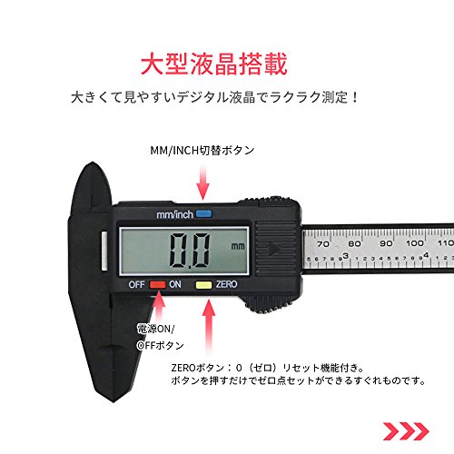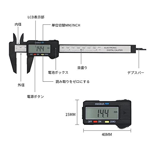 - ▲高精度&耐久性:スタイリッシュデザインのデジタルノギス!「inch」での測定範囲:0-6.00inch 最小読取值:0.01inch 「mm」最小単位0.1mmで、150ミリまで測定が可能!そして、軽量で耐久性のある強いプラスチックの炭素繊維複合材で長く使えます。