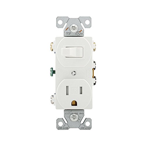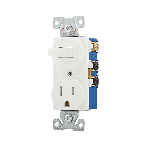 Break-off provision for wiring both devices on the same circuit or on separate circuits. The Eaton TR293W 15-Amp 120-Volt 5-15 3-Wire combination receptacle and toggle switch features UL listed tamper resistant shutters designed to prevent the Insertion of foreign objects. TR274 features a neon pilot light which is on when switch is on. Switch is horsepower rated for motor loads per UL 20. Thermoplastic toggle, top and back body are virtually unbreakable to deliver years of durable performance. Ultrasonic welding and integrated construction of the strap and body provide superior Ground integrity even under heavy use. Durable, injection molded housings and PVC resin comply with UL94 V0 Flammability ratings. Tri-combo screw heads offer greater installation flexibility.