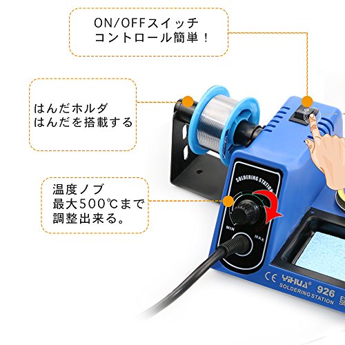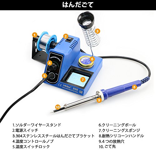 - 【はんだ付けアクセサリが含まれている】 多くの便利なはんだ付けアクセサリが含まれています:ステンレス製の鉄製のスタンド、はんだホルダ、クリーニングボールとスポンジ、半田、交換用ごて先