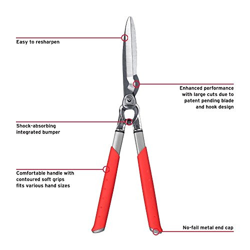 Shock absorbing integrated bumper. Take pride in your property with the Corona Dual Cut Hedge Shears. Soft grips and a shock-absorbing bumper mean comfortable use, and the blade-and-hook design means your job is easier. Dimensions: 8.2W x 3.7D x 26H in.. Handles have contoured soft grips. Fits various hand sizes. Enhanced performance for large cuts. Shock absorbing integrated bumper.