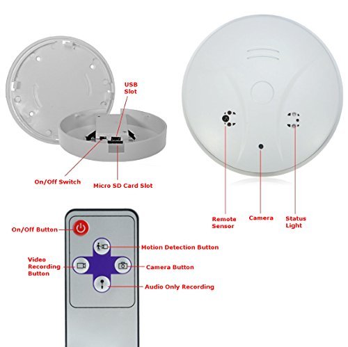 - MOTION ACTIVATED & REMOTE CONTROLLED - When set to motion detection mode using the remote your spy cam records video automatically when motion. Additionally, the slim & small smoke detector camera remote controller also allows you to covertly snap photos and start/stop all recording features.