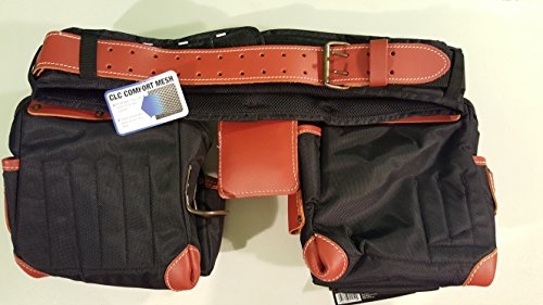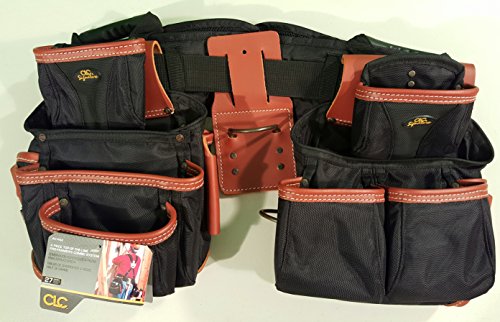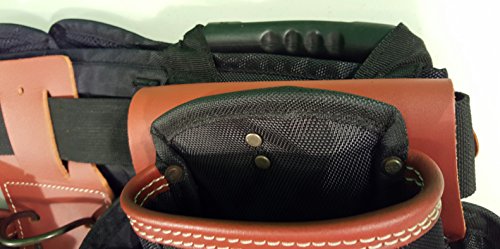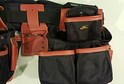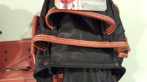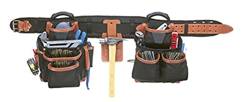 Crafted from super tough, double layered 1680D ballistic nylon and top grain leather., 8 Main reversed nail and tool pockets., 19 Smaller pockets fit pliers, nail sets, pencils, knife, etc., 5" wide padded comfort belt with double tongue steel roller buckle., Fits waist sizes: 29"-46".