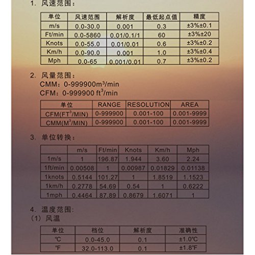 - 風速範囲:0〜30m / s;風速単位:m / s、Km / h、ft /分、ノット、m ph