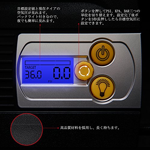 - 【LCDデジタル表示】LCDスクリーンが装着、夜でも現在の空気圧を簡単に測定できます。PSI・KPa・BAR三種の単位に表示できて、ワンタッチですぐ切り替えられます。3メートルのソケットプラグコードがあり、Fセグメント車にもうまく対応できます。