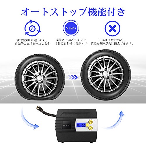 - 【オートストップ機能・急速充填】設定空気圧に達したら、自動的に充填を停止します。【ご注意:エンコードボタンを3秒長押しして数値設定できます】操作完了後5分ぐらいで本体も自動的に電源オフ。0-250KPAはわずか5分、誤差も5KPA以内に控えできます。(ご注意:当商品が対応できる最大電流は10Aで、車を始動してから接続してください。)