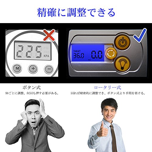 - 【ロータリーで簡単設定・メモリー機能】ボタン式より、ロータリーボタンを回れば目標空気圧を設定することができます。設定完了後、ボタンを長押しして自動的にメモリーされ、何度も設定し直し手間を減ります。