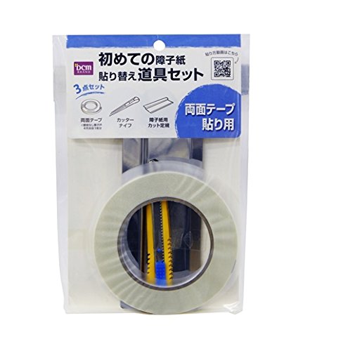 両面テープ85mmx20m腰板なし障子 4列8段1枚分)カッターナイフ・障子紙用カット定規。【注意事項】幼児の手の届く場所には保管しないでください。定規、カッターナイフを使用するときは、けがをしないよう十分に注意してください。表示の用途以外に使用しないでください。使用上の注意をお読みください。