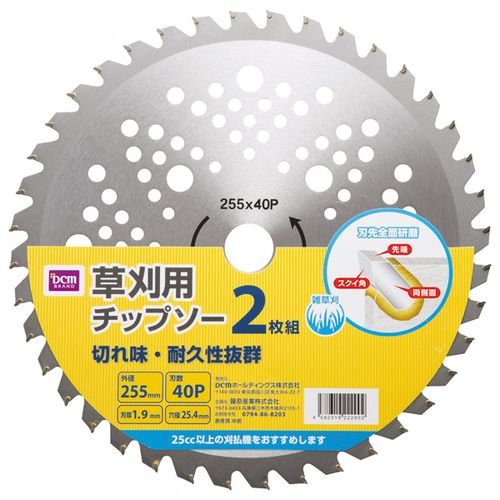 ●DCMカーマ、DCMダイキ、DCMホーマック、DCMサンワ、DCMくろがねや全国展開ホームセンターDCMグループのオリジナル商品です!●雑草刈用●刃先全面研磨●外径25.5cm●刃数:40P●刃厚1.9mm●穴径:25.4mm●2枚組●25CC以上の刈払機をおすすめします