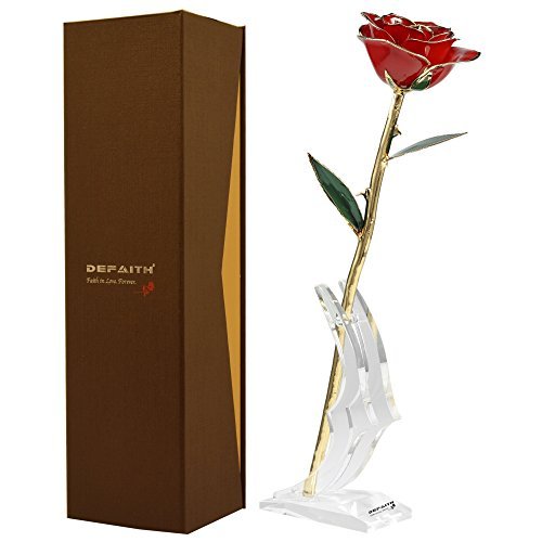 Red Gold Rose, DEFAITH 24K Gold Trimmed Long Stem Real Rose with Moon-shape Rose Stand. Last a Lifetime. Best Anniversary Gift.