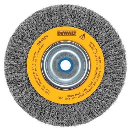 Product Description Heavy duty bench grinder brush with wide face and coarse carbon steel wire for heavy duty burr and flash removal, cleaning, edge blending, and surface reconditioning. Wire size: .014''. . From the Manufacturer DEWALT DW4908 10' Crimped Bench Wire Wheel, 3/4' Arbor, Wide Face .014'