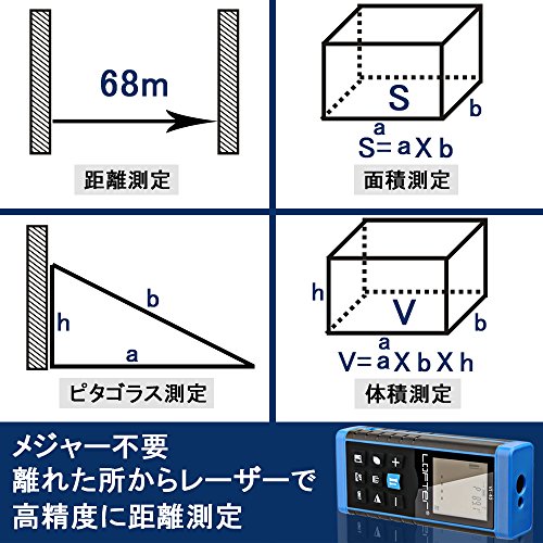 - 【1台5役】距離/面積/体積・容積/ピタゴラス(辺測定)/連続測定という作業に応じて選べる5種類の測定モードがあり、幅測定範囲は0.03~40m、誤差が±1.5mmで非常に高精度で測定できます。また測定値の加算、減算機能もついて、非常に便利な距離測定器です。