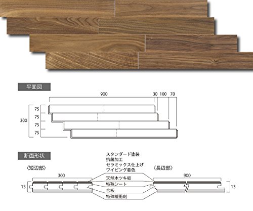 - 色:ウォルナット 雁形状 表面仕上:天然木単板仕上げ すべりにくい仕上げ 抗菌 すり傷が付きにくい加工 床衝撃遮音性能:LL45(同等性能) シックハウス:F★★★★(同等性能) 抗菌仕様
