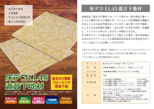 - ※この商品は一度に購入できる数が最大25枚までとなっております LL45対応遮音下地材 貼るだけ簡単フローリング床デコ施工時にLL45基準に適合します 軽量床衝撃音:LL45 床衝撃音レベル低減試験:デルタLL(I)-3 一般的なマンションで必要とされる防音効果を満たす下地材です。(貼るだけ簡単フローリング床デコと組み合わせでJIS規格適合済み)