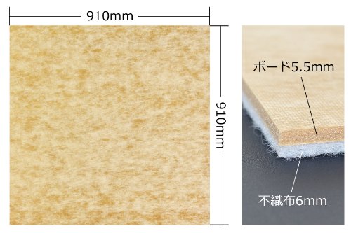 - 寸 法 910mm×910mm 厚11.5ミリ (基材厚:5.5mm 防音マット:6mm) 基 材:特殊構造 発泡体 色 基材:ベージュ 防音マット:ホワイト シックハウス F★★★★同等品(ホルムアルデヒド未検出) 販売単位 1枚単位で販売