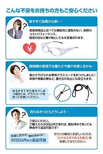 - 👓【すぐに使える・疲れにくい】老眼鏡ではありませんので検査は不要、すぐにお使いいただけます。程よい拡大倍率で、目への負担も最小限。重さもわずか45gと軽く、長時間かけても疲れません。付属のグラスコードで掛け外しの際も楽チンです。