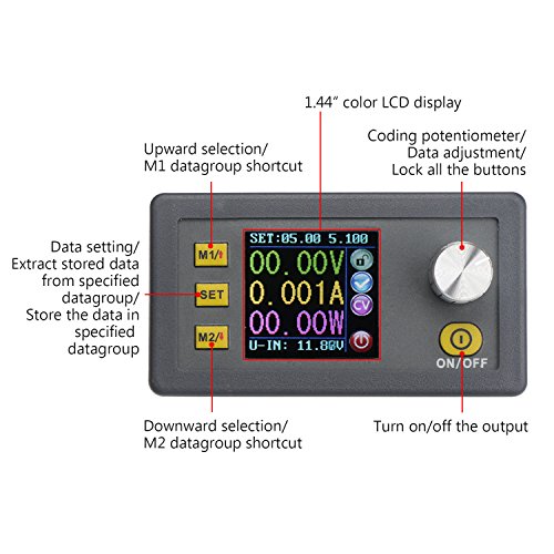 - モジュールのLCD表示は、電圧計と電流計の機能を備えています。 LCD表示を使用すると、デフォルト電圧、入力電圧、出力電圧、デフォルト電流、出力電流、出力電力などを確認することができます。