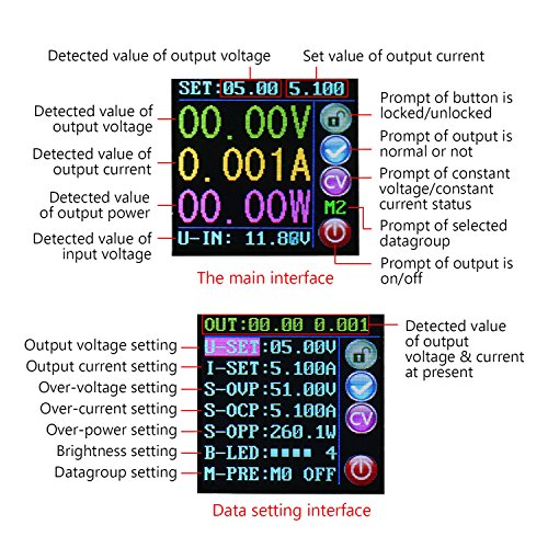 - 出力状態通知領域では、出力が開いているかどうか、出力が正常かどうか、キーがロックされているかどうか、、および使用されている現在のデータグループを参照してください。設定データインターフェースでは、過電圧値、過電流値、過電力値、データセット、LCD輝度を調整することができます。