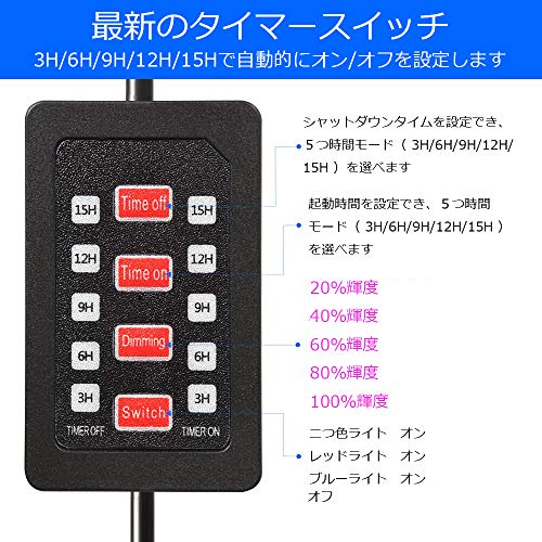 - 【タイマー機能・輝度調整機能付き】この室内栽培ライトは輝度(20%/40%/60%/80%/100%)と時間(3H/6H/9H/12H/15H)を控えます。異なる植物のニーズに応じて、明るさと点灯時間へ細かく調整することができます。(サイクルタイマーではありません。自動オン/オフ手順が実行された後、再度設定する必要があります。ご了承してください。)