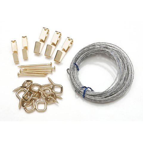 Picture Hangingセット – 盛り合わせハンガー、アイレットとワイヤ – 真鍮メッキ – 18ピース