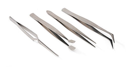 Darice jewelry tweezers set includes one of each style: fine permanent shape-reversible action, curved tip, general use and wide flat tip. Four styles of tweezers per package.