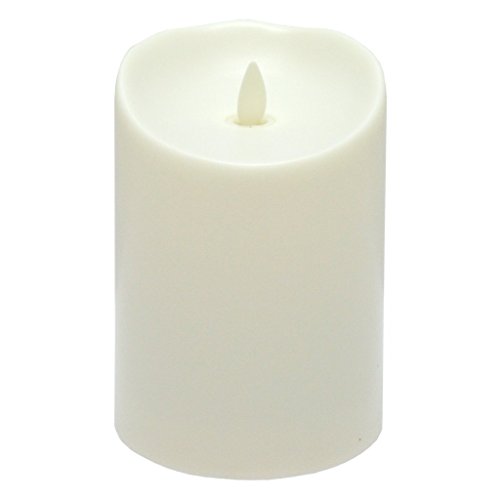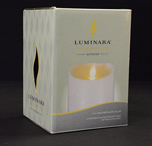 - This ivory Luminara flameless outdoor pillar style candle with timer measures 3.75 x 5 inches and offers a pleasing vanilla scent.