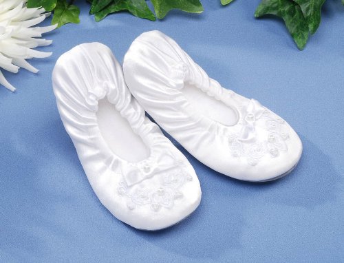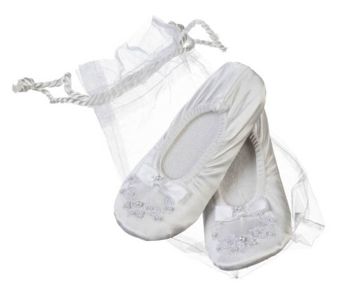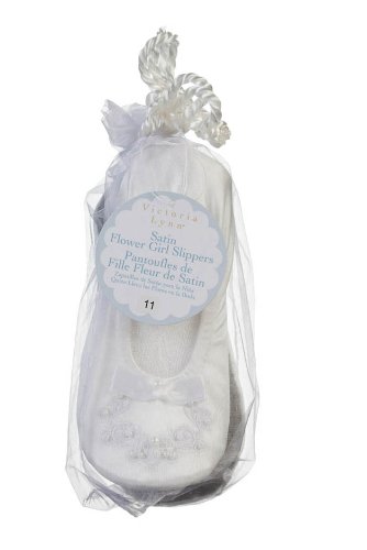 Victoria lynntm白いサテンの花の女の子バレリーナスリッパは貴重なフラワーガールの愛らしいアクセサリーです。これらのホワイト飾られ、サテンスリッパはサテンリボン、ホワイトの刺繍であり、白真珠がついている。チュール含まれているバッグドローストリング開閉。