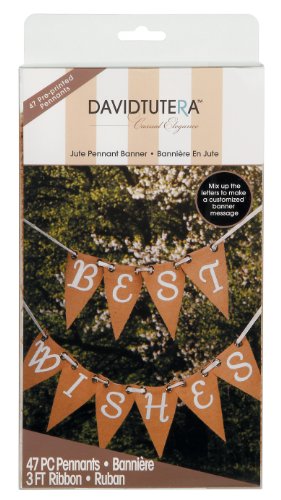 With 47 pre-printed pennants, this jute pennant banner kit by David Tutera Casual Elegance is a great way to add natural charm to your special day. Mix up the letters to make a personalized message for your guests! Each kit contains 47 grommetted pennants and 3 feet of cream ribbon for hanging. Burlap pennants measure approximately 8 inches long. 1 kit per package.