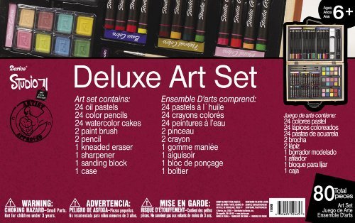 Studio 71 deluxe art set overflows with color and creativity. For the serious artist. Set includes 24 color pencils, 24 oil pastels, 24 watercolor cakes, 2 paint brushes, 2 drawing pencils, pencil sharpener, kneaded eraser and sanding blocks. Provides an artist with a wide range of materials in a compact, portable wood case with handle. Small parts, not for children under 3 years.