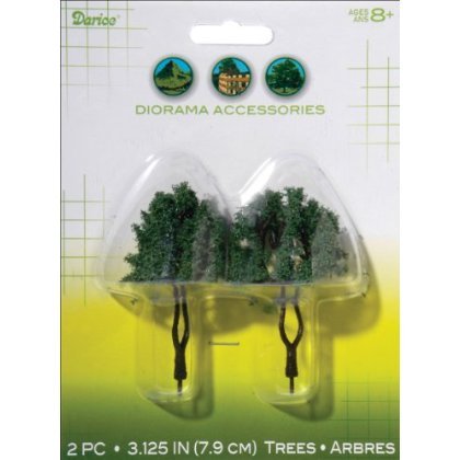 This diorama trees comes with flocked leaves. Great for model trains, doll houses, school projects and other small scale displays. Rounded trees that are covered with a fiber like green powder, giving them a living tree appearance. Measures 3-1/8-inch height. Each package contains two trees with plastic stands.