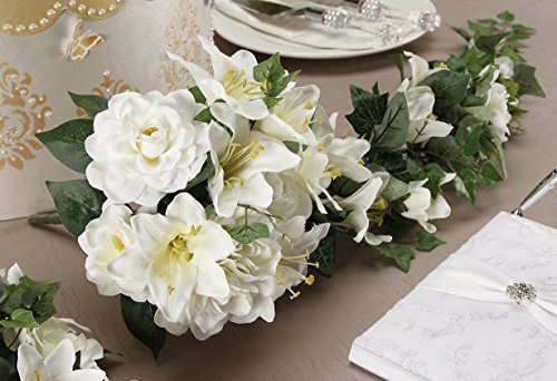 Lily/gardenia cascade bouquet. Silk floral garland is filled with creamy white lilies and gardenias and carefully enhanced with multi-shaped green silk vine leaves. Perfect garland for decorating pews, lattice work, tables, bridal arches and more. Easily create lovely floral arrangements. Available in white color.