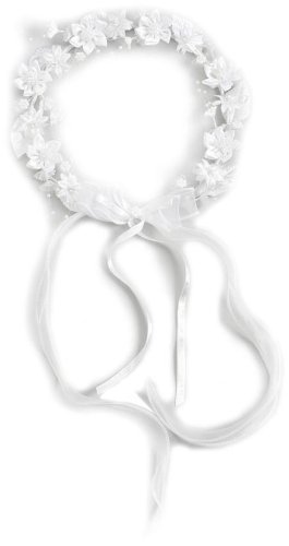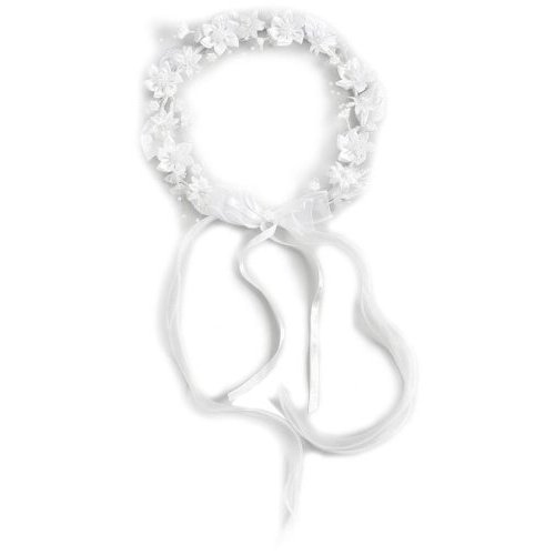 Delicate white floral crown will make a lovely addition to any bride's veil or coiffure. Consists of white satin ribbon flowers and white silk flowers accented with tiny pearls and pearl sprays on a sturdy white frame. Features sheer ribbon trailer topped by pearl accented narrow white satin bow. Flowers measure 3/4 inch to 1 inch wide, leaves about 1-1/2 inches long. Part of the popular Victoria Lynn bridal product line.