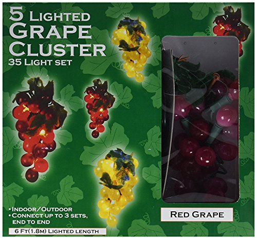 Darice decorative red grape cluster lights. Light set can be used indoors and outdoors, to add a fun addition to a wine bar or a patio party. Each light strand has 5 clusters of grapes measuring 5 inches each, with 7 lights in each cluster along a 6 foot green wire light strand.