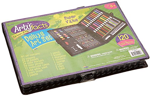 This Arty Facts 120-Piece Set overflows with color and creativity. Look at the possibilities-markers, pencils, pastels, watercolors and plenty of accessories. All in a closeable, book-like case. A portable art studio to take with you wherever you go. Includes the following supplies: 24 markers, 24 crayons, 24 color pencils, 24 oil pastels, 12 watercolor cakes, 2 clips, 1 white watercolor tube and 1 of each: palette, paintbrush, drawing pencil, sharpener, eraser, ruler, sponge and scissors. Small parts, not for children under 3 years.