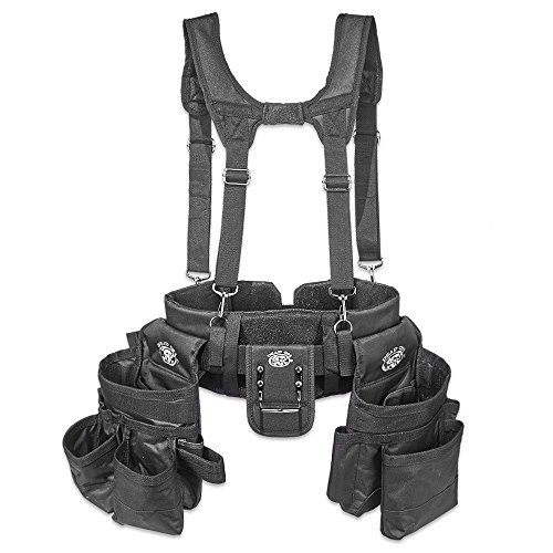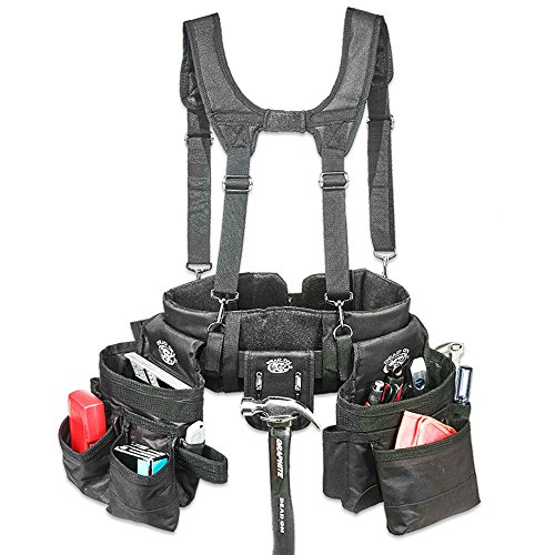 Framer's rig with 32 integrated pockets for nail and tool storage, 4 boxed front nail pouches and a rafter square pocket, Ballistic nylon fabric for maximum life; moisture-wicking inner lining, Size large; adjusts from 28 to 36-Inch, includes suspenders, Weighs 5-Pound shipped