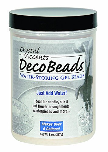 Deco Beads, Spring Green color. 8-ounce jar. Water-storing gel beads. Ideal for candle, silk and cut flower arrangements. Use for centerpieces, weddings, birthdays, parties and home decor. Just add water. 8-ounce jar makes 6 gallons. Takes the place of marbles with less weight. Non-toxic.