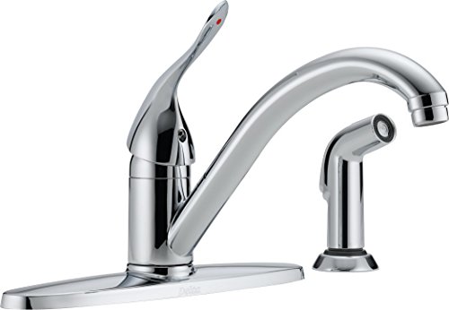 Water Efficient Product meeting CALGreen standards. With the Delta Classic 400LF-HDF Single Handle Kitchen Faucet with Side Spray you can get commercial-grade performance with elegant contemporary style. The all-brass construction means this faucet is ready to battle corrosion and bacteria. Getting the largest pots and pans past the spout is easy with its high-arcing and swiveling design. Rinsing dishes and produce is a breeze thanks to the convenient side sprayer. Just give the single handle a tug and twist to dial in the perfect temperature and pressure for any task at hand. Product Specifications: Mount Type: Deck Mount Handle Style: Lever Valve Type: Ceramic Disc Flow Rate (GPM): 1.5 Swivel: 360 degrees Spout Height: 4.75-inch Spout Reach: 8.69-inch About Delta Faucet Pairing inspirational design with innovations that anticipate people's needs, Delta produces kitchen faucets, bathroom faucets, and shower systems that are as beautiful as they are functional. Delta puts all of their products through a strict regimen of durability testing. Delta Faucet is committed to green manufacturing processes and helping people to be smarter and more environmentally responsible in how they use water. All of these things add up to show how Delta is more than just a faucet. Easy installation with 3 faucet holes. Single handle for smooth temperature control. Durable brass construction with a dazzling chrome finish. Ceramic disc valving for a lifetime of drip-free performance. Dimensions: 8.69L x 9.13H inches. Manufacturer's limited lifetime warranty.