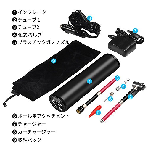 - パッケージ内容:インフレータ*1、チャージャー*1、カーチャージャー*1、チューブ1*1、チューブ2*1、仏式バルブ*1、プラスチックガスノズル*1、ボール用アタッチメント*1、収納バッグ*1、日本語説明書*1。付属品がいっぱいありますので、電動エアポンプセットとして、素晴らしい選択です。